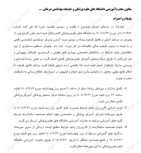 احتراماً، در راستای اجرای موضوع «بند ۴» یکصد و سومین نشست شورا که طی نامه شماره ۱۹۸۶/505/د مورخ ۱۴۰۴/۰۵/۲۳ به دانشگاه‌های علوم پزشکی کشور ابلاغ گردیده است، مقرر شد پس از پذیرش در مراحل اصلی و تکمیل ظرفیت پنجاه و دومین دوره آزمون پذیرش دستیار تخصصی بالینی و با توجه به وجود ظرفیت خالی باقی‌مانده در هر دوره، پذیرش مستقیم دستیار از بین متقاضیان واجد شرایط در رشته‌های تخصصی (بیماری‌های عفونی و گرمسیری، کودکان، بیهوشی، طب اورژانس و سایر رشته‌های مرتبط) از طریق مرکز سنجش آموزش پزشکی کشور انجام گردد. در همین راستا ثبت‌نام و بررسی مدارک داوطلبان انجام می‌پذیرد. لذا مقتضی است ترتیبی اتخاذ گردد تا مراحل تکمیل ظرفیت و اعلام نتایج نهایی مطابق زمان‌بندی‌های اعلامی انجام و در اسرع وقت به داوطلبان اطلاع‌رسانی شود.